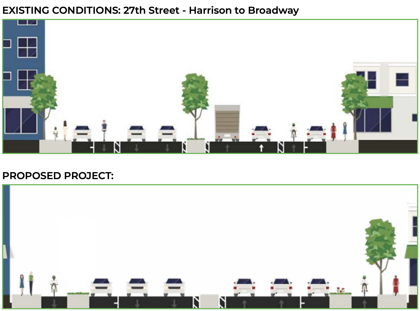 Part of 27th Street was among Oakland’s first protected bikeway upgrades in 2019, but only in one direction and for one block east of Broadway as part of a housing development project. Now Oakland has received $8.3 Million in county funding to upgrade and extend this protected bikeway in both directions between Telegraph and Grand Ave, also including concrete protected intersections. The project will connect to additional protected bikeways (info here) in the works on Harrison Street, Grand Avenue, Telegraph Avenue, Lakeside Drive, and 20th Street.