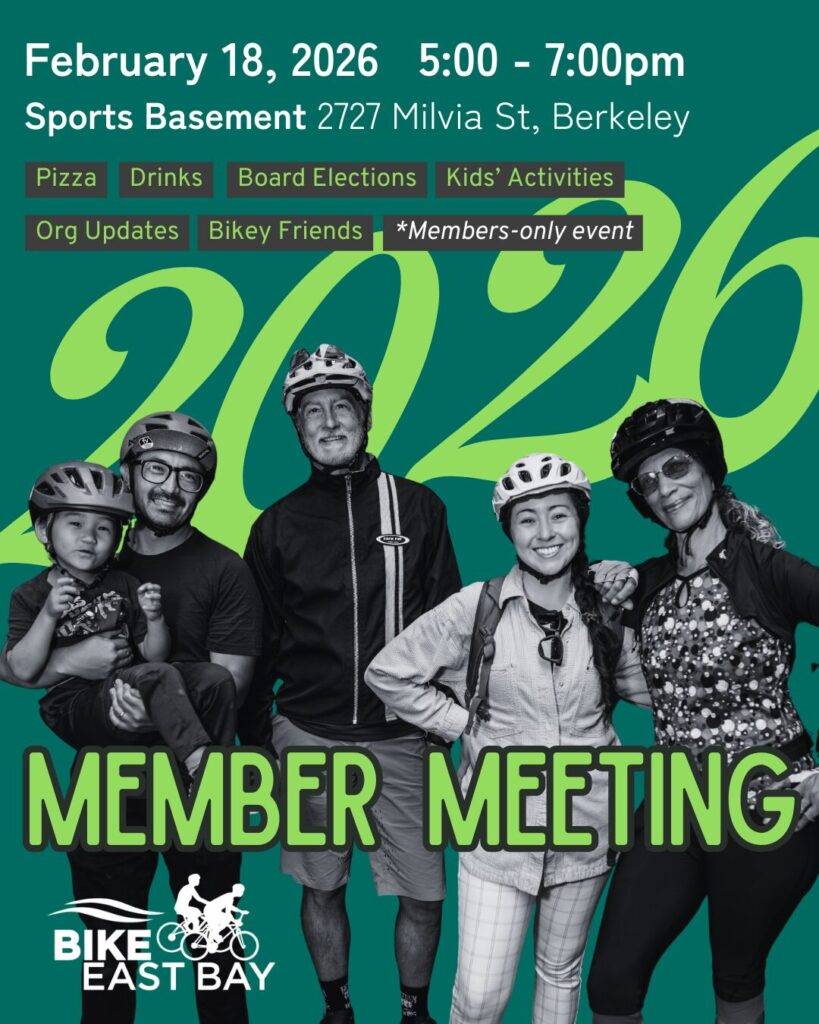 Join us for Bike East Bay’s annual Member Meeting at Sports Basement in Berkeley. Enjoy complimentary pizza (vegan & gluten-free options available), beverages and family friendly activities as we vote in the 2026 board of directors election. Members will have the opportunity to meet staff, board candidates and hear updates on Bike East Bay’s goals and initiatives for 2026 from our Co-Executive Directors. This event is kid friendly and open to all Bike East Bay members.